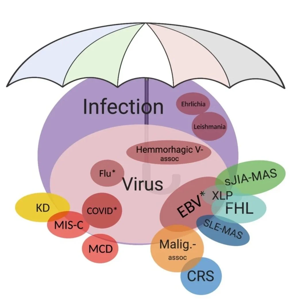 Adapted from Henderson LA, Canna, SW, et al., Arth & Rheum, 2020. SJIA: Systemic Juvenile Idiopathic Arthritis; MAS: Macrophage Activation Syndrome; HLH: Hemophagocytic Lymphohistiocytosis; EBV: Epstein-Barr Virus; MCD: Multicentric Castelman Disease; KD: Kawasaki Disease: MIS-C: Multisystem Inflammatory Syndrome (assoc. with SARS-CoV2) in Children; ARDS: Acute Respiratory Distress Syndrome; CRS: Cytokine Release Syndrome
